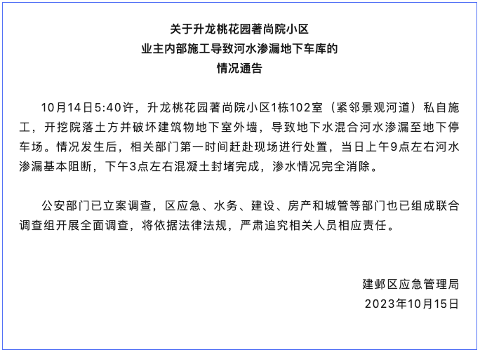 网传南京一业主滥挖地下室致河水倒灌车库,官方传达:众部分侦察追责。